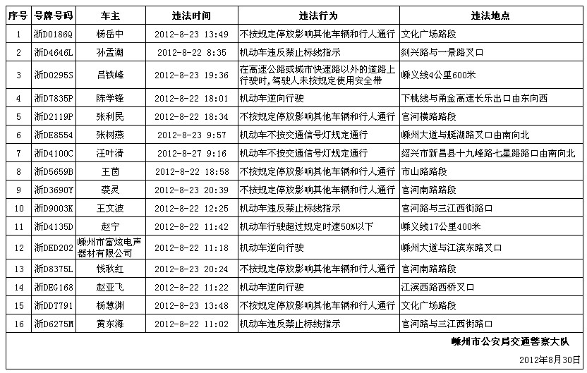 下列机动车和驾驶人因有交通违法行为被交警查处,现予以曝光: