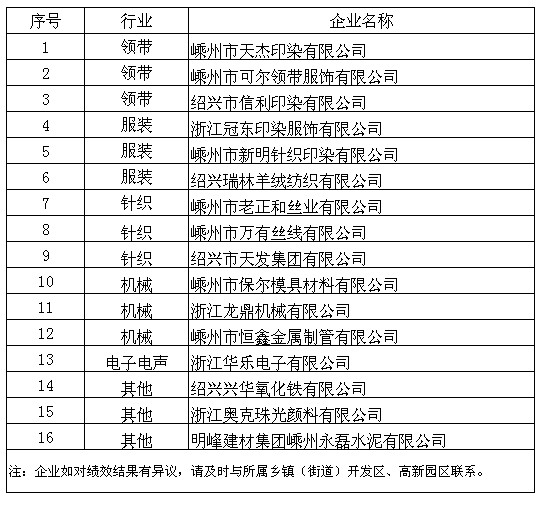嵊州市2012年二季度各行业规模以上用能绩效红牌企业