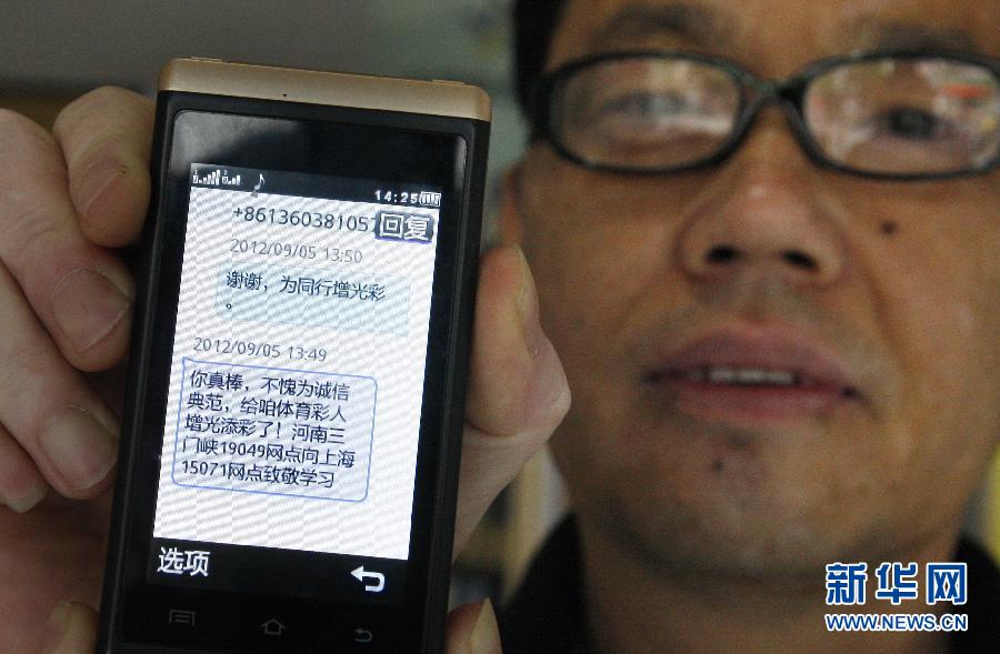 河南同仁发来的一条短信让徐辉觉得非常欣慰(9月5日摄)。