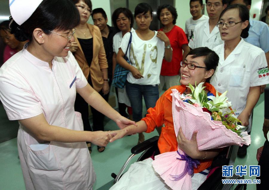 9月5日,医护人员欢迎“最美女教师”张丽莉(前右)。