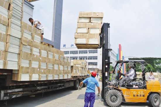 嵊州市科达新型建材有限公司研发的PUB•F聚氨酯防水保温集成板和PUB•S聚氨酯保温装饰集成板,是国家推广的新型外墙保温装饰材料,成为南京市政府在建800多万平方米建外墙保温装饰材料供应商。图为该公司的新型保温装饰集成板材正在装车,准备发往南京。