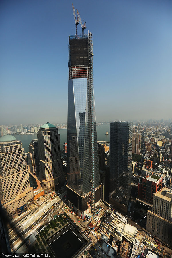 当地时间2012年9月7日,美国纽约,重建中的世贸中心。纽约在为纪念9·11恐怖袭击11周年做准备的同时,世贸中心的重建工作也在继续进行。除重建的世贸中心大楼外,在9·11事件10周年时,在纽约世贸中心原址上建立并开放了9·11纪念碑和纪念馆。