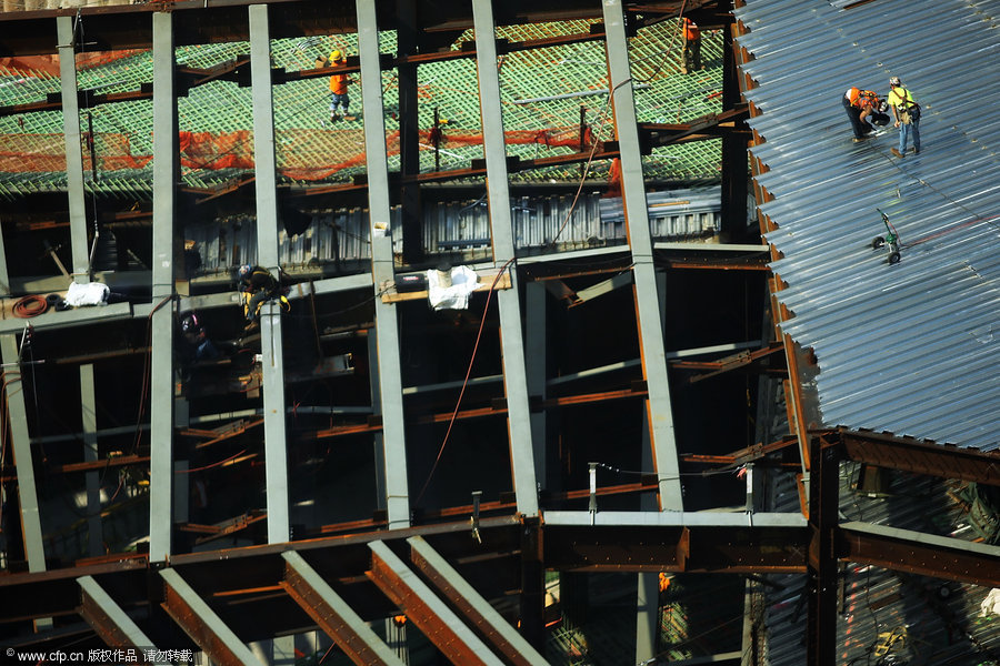 当地时间2012年9月7日,美国纽约,重建中的世贸中心。纽约在为纪念9·11恐怖袭击11周年做准备的同时,世贸中心的重建工作也在继续进行。除重建的世贸中心大楼外,在9·11事件10周年时,在纽约世贸中心原址上建立并开放了9·11纪念碑和纪念馆。