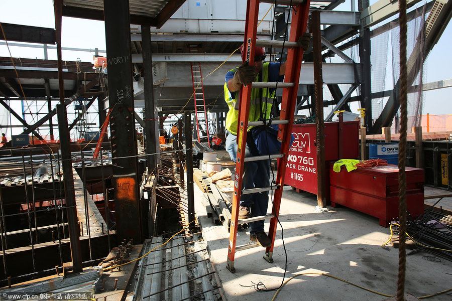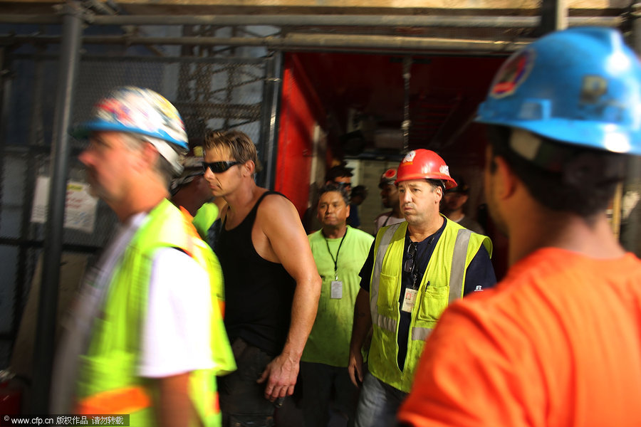 当地时间2012年9月7日,美国纽约,重建中的世贸中心。纽约在为纪念9·11恐怖袭击11周年做准备的同时,世贸中心的重建工作也在继续进行。除重建的世贸中心大楼外,在9·11事件10周年时,在纽约世贸中心原址上建立并开放了9·11纪念碑和纪念馆。