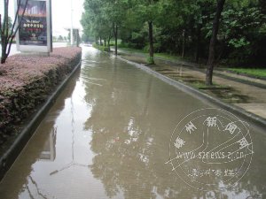 昨日的大雨,浇灭了刚刚来临的“秋老虎”,给市民带来了丝丝凉意。但由于雨水来得太快太急,造成市区一些路段排水不畅。这是记者拍摄的卧龙山水小区附近一地段,已是汪洋一片,许多电瓶车主只好绕道行驶。
