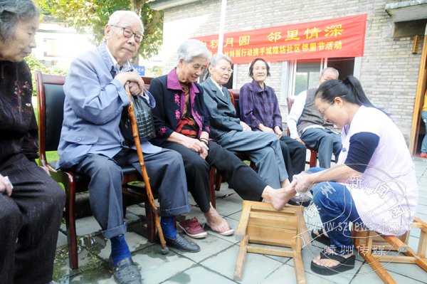 为老年人进行义诊,免费理发、修脚、洗头,体现了志愿者们的一片爱心;社区“戏迷角”成员还特地赶来为老年人演唱;附近的居民则亲手制作了色香味俱全的菜肴,体现出一片邻里情深。老人们满意地笑了,他们说,这是一个难忘的“节日”。