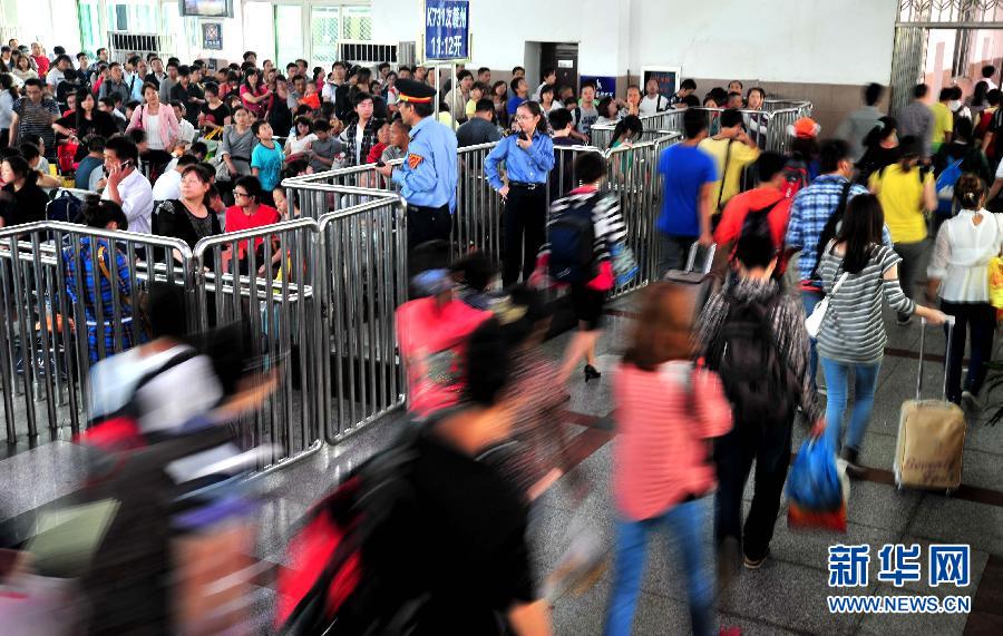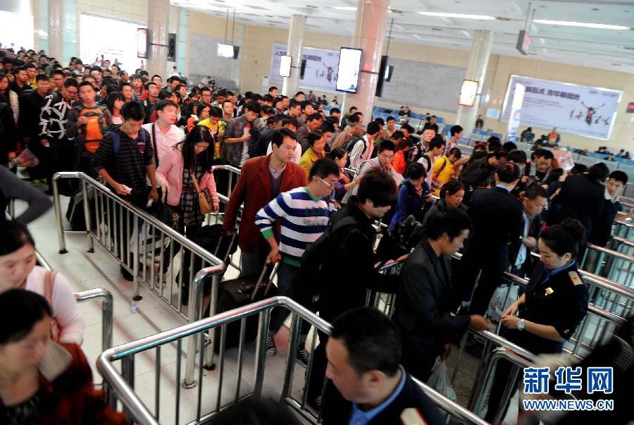 10月6日,一批前往北京方向的旅客在重庆火车北站检票上车。
