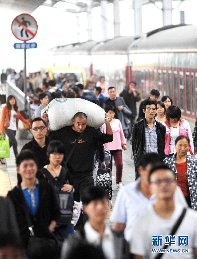 10月6日,从西安方向到达重庆火车北站的旅客在出站。