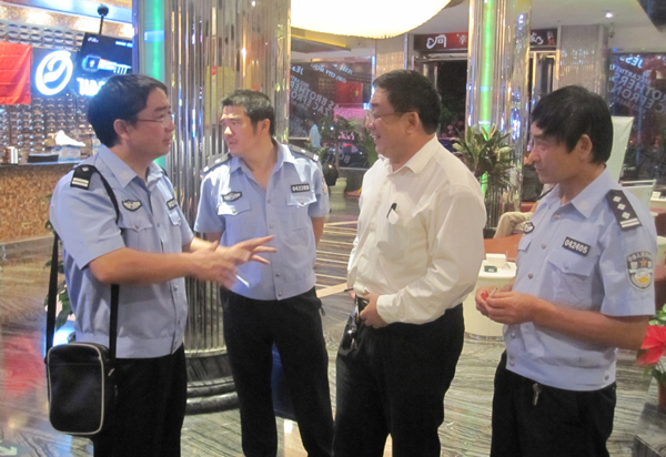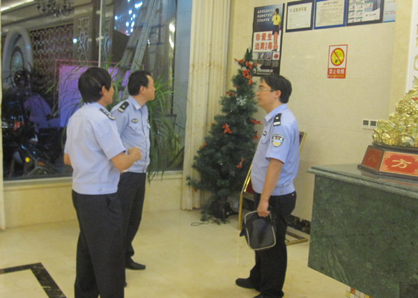 为切实维护我市国庆期间的社会秩序稳定,确保娱乐服务场所健康娱乐、消费,结合我局开展的“迎国庆、保平安”集中统一行动,2012年9月28日晚,嵊州市局禁毒大队会同三江派出所对三江街道辖区内的重点娱乐场所进行了检查。此次活动,重点检查了娱乐场所禁毒“三步曲”、保安巡查等各项防毒措施的落实情况。