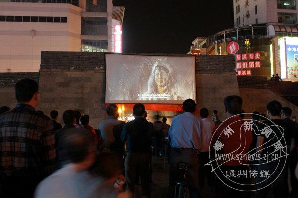图为10月7日晚上群众观看电影《画皮2》的场面。