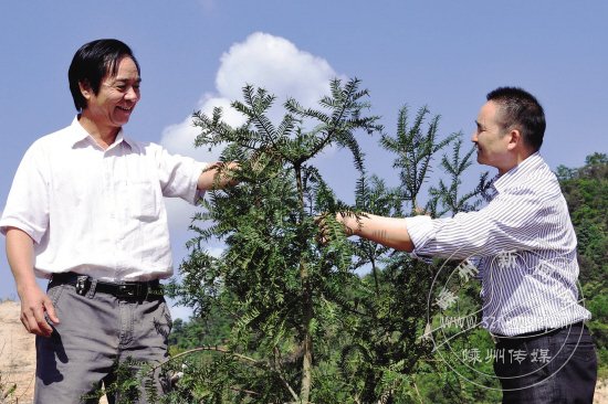 在谷来镇金山湖村竿竹山自然村的荒山上,建起了1000余亩香榧基地。这是三年前,当地的几位工商业主通过土地流转,反哺农业,投资种植香榧树建成的香榧基地。图为昨日,几位投资的工商业主正在查看香榧苗的长势。