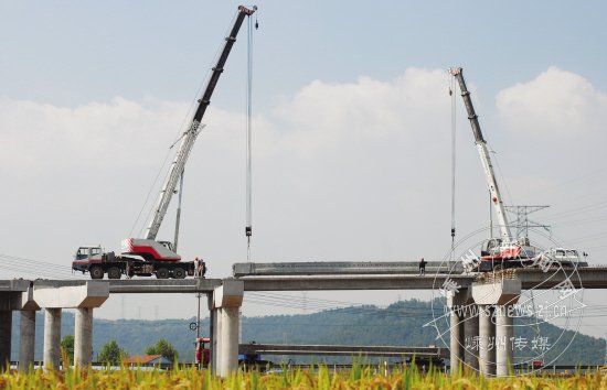 昨日上午,两台50吨吊机在104国道嵊州段改建工程第七合同段圳塍分离式立交桥上安装20米长的空心梁板。在本月15日前,施工方将安装完成360块空心梁板,为圳塍分离式立交桥下一步施工奠定基础。