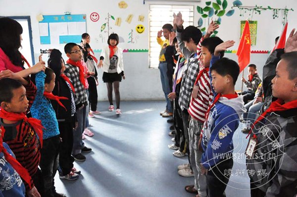 10月13日是少先队建队纪念日,在这个特殊的日子里,市育才学校又有一批智障儿童加入了少先队组织。在庄严的国歌和明快的队歌里,该校老队员为新队员戴上了鲜艳的红领巾。图为新队员入队场景。