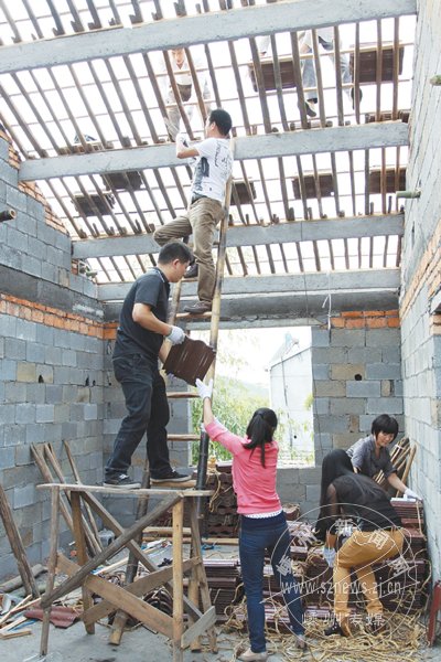 顾不得歇口气,大家又开始帮泥水匠师傅做小工。泥水匠师傅打趣这些“细皮嫩肉”的“小工”说,到时候你们可别闪了腰,伤了筋骨,他们不相信眼前这几位小工的劳力。