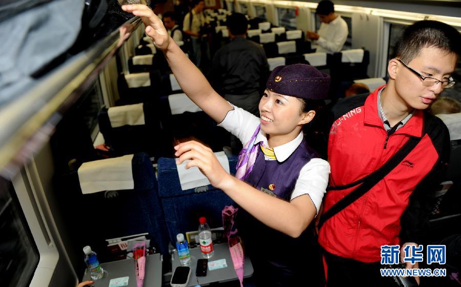 10月16日,服务员在合肥至北京南G262次列车上整理行李。当日,合肥至蚌埠高速铁路正式开通运营。合蚌高铁是京沪高铁与沪汉蓉客运专线间的高速连通线,也是北京至福州客运专线的组成部分。运营里程132公里,沿线设合肥、合肥北城、水家湖、淮南东、蚌埠南、蚌埠等6座车站,设计时速350公里,运营初期按时速300公里运行。合蚌高铁开通运营,不仅形成合肥北上的快速通道,而且通过已投入运营的合宁、沪宁、合武高铁,把京广、京沪、沪汉蓉三条高铁主干线紧密连接起来,形成我国中部腹地通往环渤海、长三角、珠三角地区的大能力快速客运通道。新华社记者刘军喜摄
