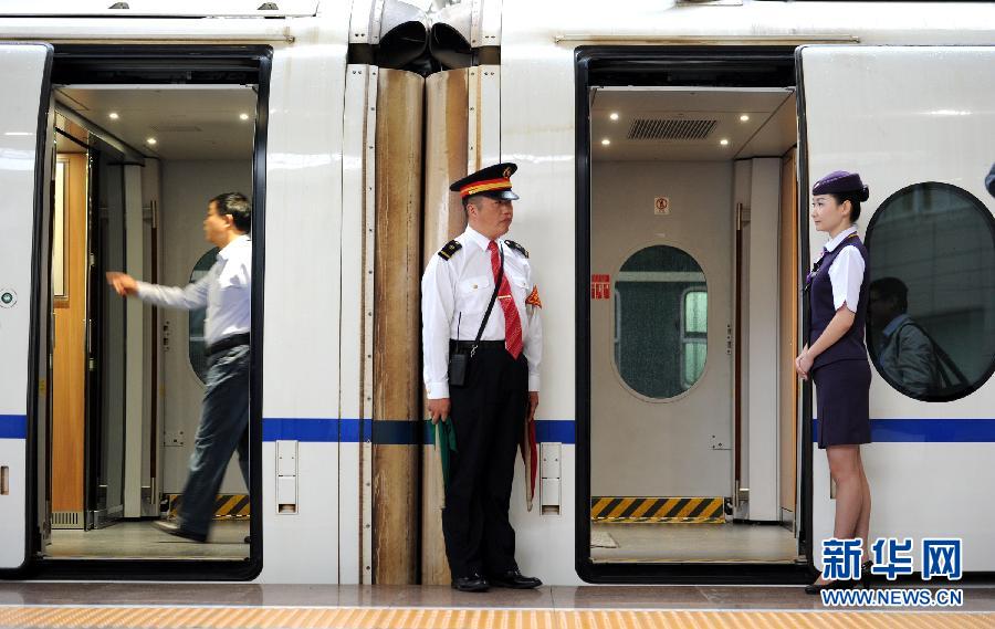 10月16日,工作人员在合肥火车站等待即将登上合肥至北京南G262次列车的旅客。当日,合肥至蚌埠高速铁路正式开通运营。合蚌高铁是京沪高铁与沪汉蓉客运专线间的高速连通线,也是北京至福州客运专线的组成部分。运营里程132公里,沿线设合肥、合肥北城、水家湖、淮南东、蚌埠南、蚌埠等6座车站,设计时速350公里,运营初期按时速300公里运行。合蚌高铁开通运营,不仅形成合肥北上的快速通道,而且通过已投入运营的合宁、沪宁、合武高铁,把京广、京沪、沪汉蓉三条高铁主干线紧密连接起来,形成我国中部腹地通往环渤海、长三角、珠三角地区的大能力快速客运通道。新华社记者刘军喜摄