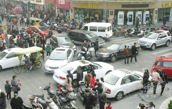 私家车摩托车电瓶车黄包车,男人女人老人小孩,你不让我,我不让你,把道路挤得如一锅热粥,这样的交通秩序道路如何能畅通?请我们停下脚步想一想。图为世纪广场路段情况。