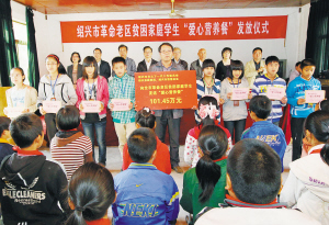 今年6月,市关工委、市教育局和市慈善总会联合出台了文件,制定了绍兴市革命老区贫困家庭学生“爱心营养餐”的实施办法,资金来源为市慈善总会。