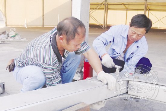 这几天的市体育中心,大吊车、装卸车来来往往,搭建展棚的工作人员正在忙碌着。据悉,近万平方米的展棚从10月18日开始搭建,将于10月24日保质保量如期完成搭建工作,迎接2012第五届中国(嵊州)电机展览会暨高新技术成果交易会如期举行。图为工作人员正在搭建展棚。