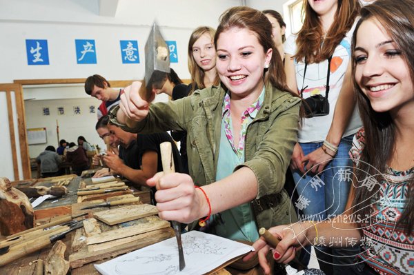 10月18日,市职教中心迎来了一批特殊的客人——德国萨尔州路德维希一级文理学院师生一行40余人,兴致勃勃地参观了该校工艺木雕专业,并向该校教师、浙江省工艺木雕大师张瑜拜师学艺。图为德国客人在木雕学习室学习。