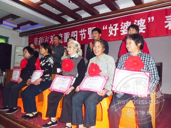 10月23日,三界镇南街村举行了首届“好婆婆”表彰典礼,村两委会向郑友妹、任桂英、尹银仙等5位“好婆婆”颁发了荣誉证书。获奖人员中,有勤俭持家、家庭和谐美满的好婆婆,有热心公益事业、支持新农村建设的好婆婆……村支书吴国灿说:“评选‘好婆婆’的目的,就是以身边的典型引领人、激励人,倡导更加和谐的村风民风。”表彰会上,村民们还自编自演了越剧、绍剧、舞蹈等丰富多彩的文艺节目。