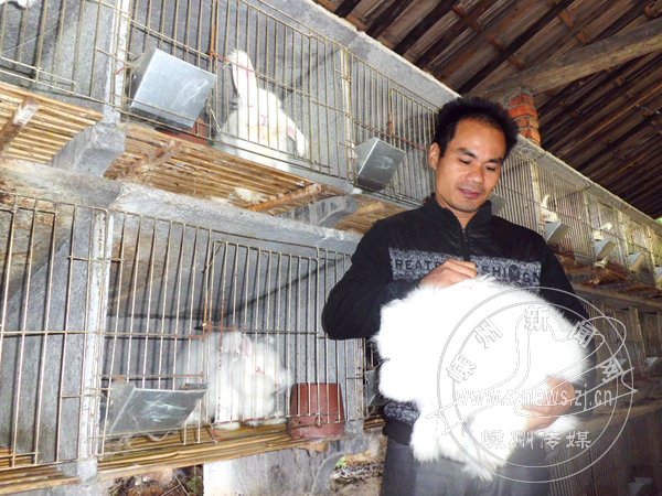 三界镇沈塘村养兔大户沈庆荣从1996年从事长毛兔养殖以来,通过不断改良品种,积极采用科学技术养兔,至目前,长毛兔存栏数达2000多只,良种兔还远销河南、山东、安徽等地。兔毛和种兔的大笔收入,让他尝到了规模养兔的甜头。图为沈庆荣正在检查长毛兔生长发育情况。