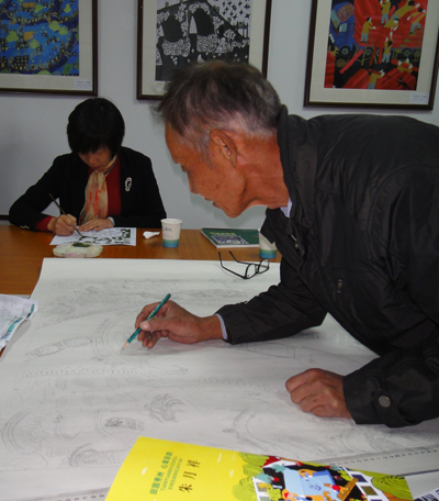 画室桌子上有几位“农民画”粉丝也在认真的创作,这些都是慕名而来学习农民画的当地居民,有纺织城里的老板、也有退休的老师等。更引人注意的是一位65岁的退休老师黄明观,正一笔一划认真地创作着。据他介绍,他就住在这附近,退休后本来学书法,后来听说家门口有位大画家,又不要求美术基础,所以就跑来跟着学,成为了粉丝团中的一份子。自从学习农民画后,朱月祥多次推荐黄明观参加大大小小各类比赛,还推荐他去参加区里的培训。目前,黄明观手上的草稿已有十几幅。