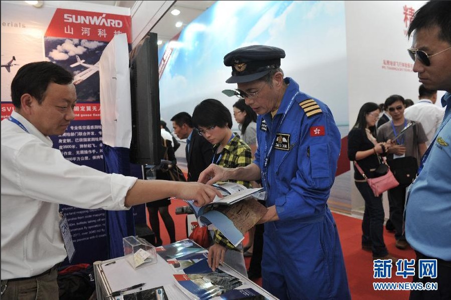 11月13日,观众在展馆内查看产品材料。当日,第九届中国国际航空航天博览会在广东珠海开幕,近650家中外航空航天厂商参展。来自军工、装备制造、中外媒体的人士以及航空、军事爱好者等云集珠海。新华社记者杨光摄