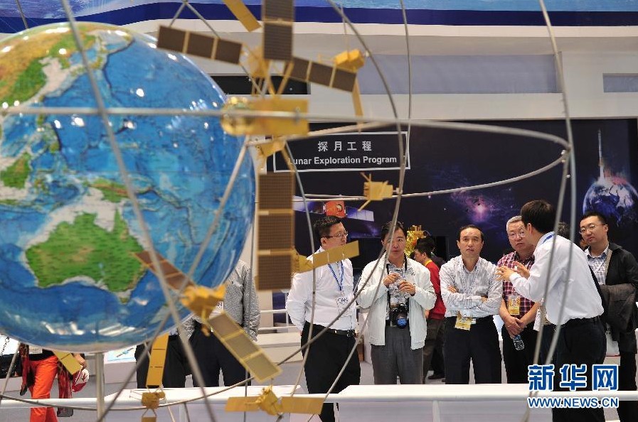 11月13日,观众在参观中国航天科技集团展出的北斗导航卫星系统模型。当日,第九届中国国际航空航天博览会在广东珠海开幕,近650家中外航空航天厂商参展。来自军工、装备制造、中外媒体的人士以及航空、军事爱好者等云集珠海。新华社记者杨光摄