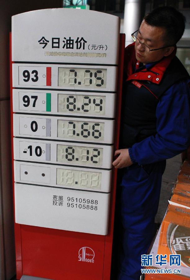 11月16日,一名工作人员在上海的一个加油站查看油价。国家发展和改革委员会11月15日宣布,自16日零时起,将汽油、柴油价格每吨分别降低310元和300元。测算到零售价格,90号汽油和0号柴油全国平均分别降低0.23元和0.26元。新华社发(丁汀摄)
