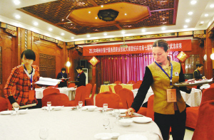 一边是参赛选手在餐桌上摆放餐具,一边是评委用尺子测量距离。11月19日,嵊州市人力社保局举办了餐厅服务员职业技能大赛暨绍兴市第七届农民职业技能比武选拔赛,来自嵊州各地的15位农民餐饮服务员参加了理论和实际操作考试,主要内容有引座与点菜、摆台、托盘、斟酒水、上菜、分菜、换盘与撤盘、餐巾折花等项目。前三名选手在获得奖金的同时,还破格晋升为高级技工。图为比赛现场。