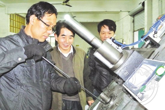 嵊州市叶峰茶业有限公司通过转型升级,成功研发多款小微电动机自动生产装备,技术处于国内同类产品领先水平,同时获得国家专利。图为企业科研人员正在调试新研发的小微电动机嵌、绕两用机械。