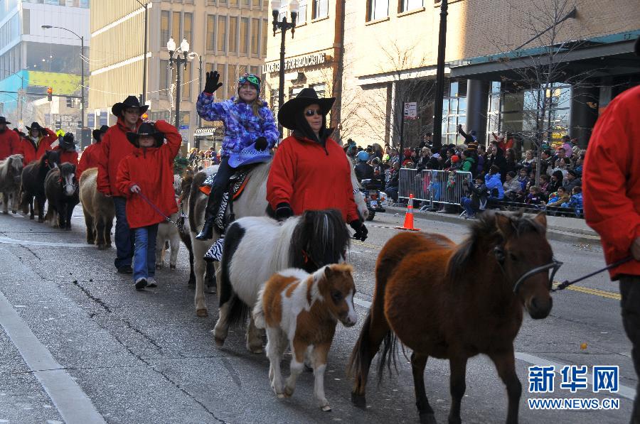 11月22日,在美国芝加哥,人们牵着小马驹参加游行。当日,芝加哥第78届感恩节大游行在市中心的州街举行,数万名芝加哥市民观看了游行。新华社记者张保平摄