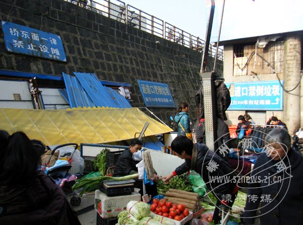 旁边立着一块“桥东面一律禁止设摊”的公示牌,但这丝毫未影响那些摊贩们卖蔬菜、卖衣服……这是昨日网友在江滨市场东侧、南桥东首拍摄到的一幕。