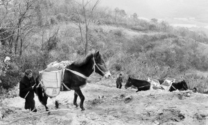近年来,嵊州市下王以及新昌县巧英、回山等地逐渐发展起了骡马运输行业,村民购买骡子,承运高山上铁塔、砂石、水泥等基础建筑材料,赢得商机。据业内人士透露,一只骡子的买价在1万元左右,而上山干一天活的收入可达400元左右,以一年出工200天计算年收入达七八万元,这对于农民来说是一笔可观的收入。这是昨天,嵊州市仙岩镇的骡马正在运输砂石材料。