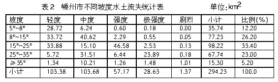 3.流失坡度。从水土流失所处的坡度状况来看,占全市水土流失面积的71.8%分布在人类生产活动较为集中的25°以下的区域,且在坡度相对较大易发生水土流失的15°~25°区域所占比例达到33.40%。占全市水土流失面积的28.23%分布在生态环境脆弱的25°以上的区域,且有5.20%分布在生态环境极为脆弱的35°以上区域。全市不同坡度水土流失情况见表2。