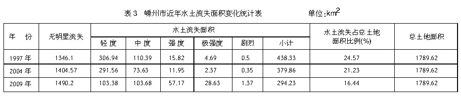 4.治理成果。从监测成果对比来看,水土流失面积从1997年的438.33km2下降到2009年的294.23km2,减少了144.1km2,下降率为32.87%,表明近年来全市大力开展水土流失综合治理,加强水土流失预防、监督起到了一定的效果,水土流失状况总体明显好转。具体见表3。