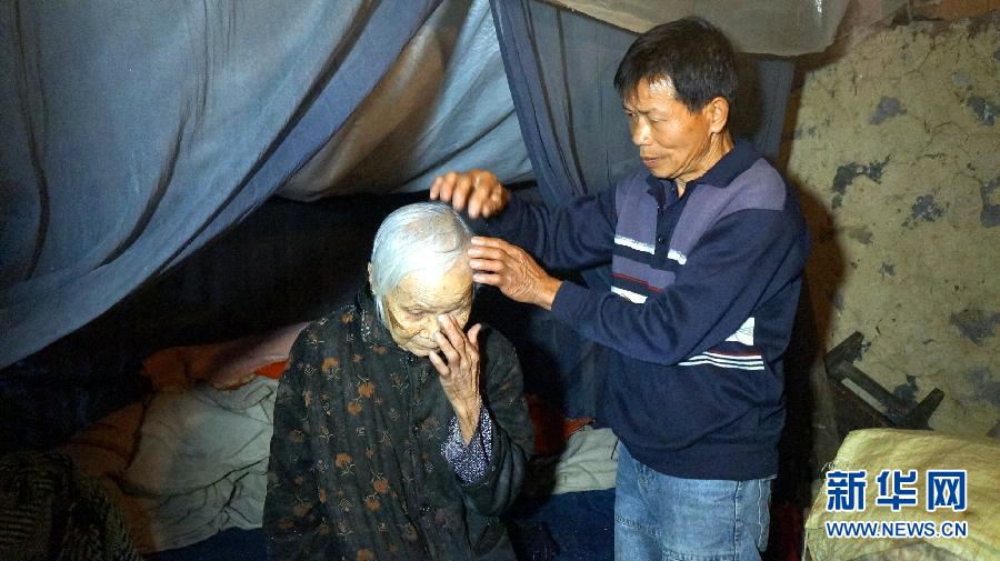 12月21日,陆理明为岳母整理头发。俗话说:“一个女婿半个儿”,而在广西大新县堪圩乡谨汤村逐怒屯村民陆月英眼里,她的女婿陆理明却胜似亲儿:女儿10多年前去世后,女婿陆理明没有抛弃这个风雨飘摇的家庭,一人支撑起这个家,并侍奉自己这个瘫痪的“累赘”。陆理明用责任书写了一个大大的“孝”字,被网民称为“最美上门女婿”。新华社记者潘强摄