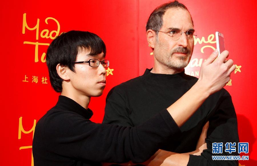 12月24日,参观者在与乔布斯蜡像合影。当日,史蒂夫·乔布斯的蜡像亮相上海杜莎夫人蜡像馆,吸引了众多参观者。新华社记者刘颖摄