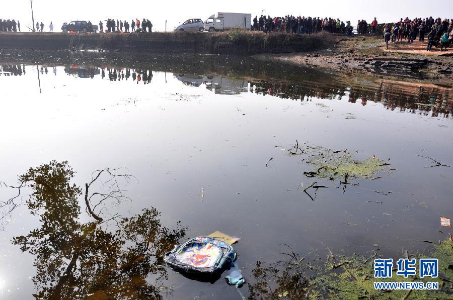 面包车侧翻坠入的水塘水面漂浮着孩子的书包(12月24日摄)。江西鹰潭市政府新闻办称,截至24日17时30分,贵溪市滨江镇洪塘村面包车坠水事故中,送医的8名儿童抢救无效死亡。此次事故遇难儿童已升至11人,另有4名仍在医院救治,已脱离危险。 24日9时许,贵溪市滨江镇洪塘村一载有15名幼儿园学生的面包车侧翻坠入水塘,当场致3人死亡,12人送医抢救。据介绍,事发水塘水深达3-4米,面积有10余亩。事故车上除司机外还有一名老师。新华社发