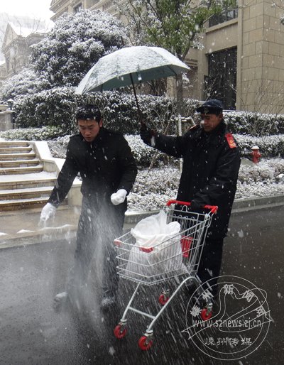在小区内的大道上撒盐、扫雪,给树摇雪,为车盖上挡雪车膜……中大剡溪花园的绿城物业公司员工们忙得不可开交。