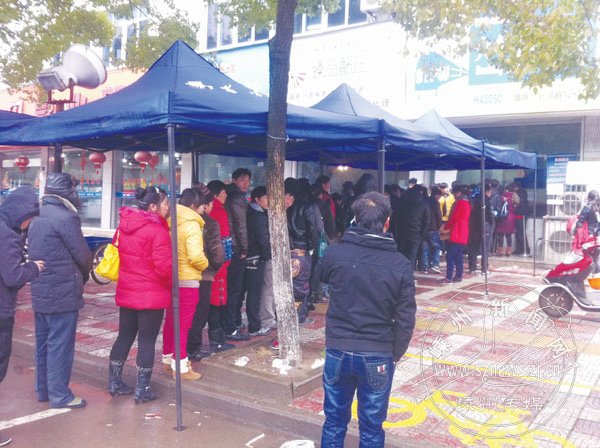 今年火车票预售期大大提前,官河路火车票代售点前也比往年更早地排起了长队,购票的人员大多为返乡的外省籍新居民。