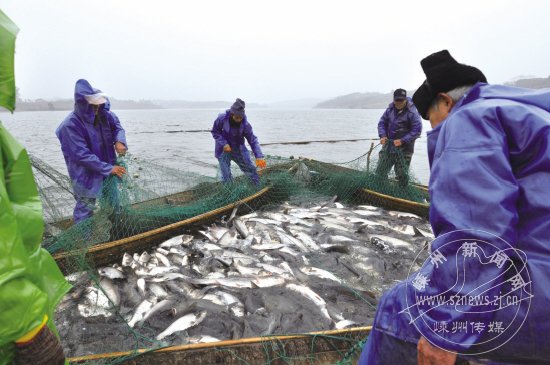 昨日,眠牛弄水库进行了一次年底大捕捞,共捕捞了4万公斤鱼,获得了大丰收,其中最大鲢鱼达9公斤。我市水产养殖面积为25380亩,农历年底已近,眼下正是各水库、鱼塘撒网捕鱼的时节。图为渔民在水库捕鱼时的场景。