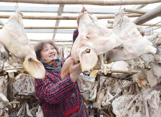 昨日,黄泽镇上一家饭店的工作人员正在忙着翻晒腊猪头。年关临近,准备年货的人越来越多,记者在该镇了解到,当地一些特色的风味年货如腊猪头、醉螃蟹等广受群众欢迎,有些甚至还作为礼品送往大城市的亲朋好友处,成为节日里人们餐桌上的美味。
