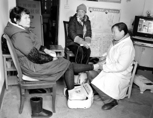 12日,嵊州市剡湖街道白莲堂社区办公楼的服务大厅里,社区居民金学勤正为三位70多岁的老人进行足疗,老人在社区享受这种服务不用花钱,只要卡里有积分;80岁以上的老人还可“赊账”。