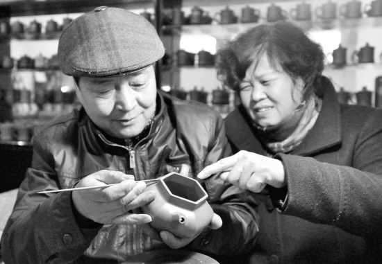 嵊州紫砂一度辉煌,但随后渐渐沉沦。紫砂工艺大师金祖稠和妻子钱小英苦苦坚守,终于使嵊州紫砂东山再起,重新赢得世人青睐。近日,在北京举行的“博艺杯全国工艺美术精品展”上,金祖稠创作的紫砂壶作品《六方如意》获得金奖殊荣。图为昨日金祖稠和妻子钱小英正在制作紫砂壶。