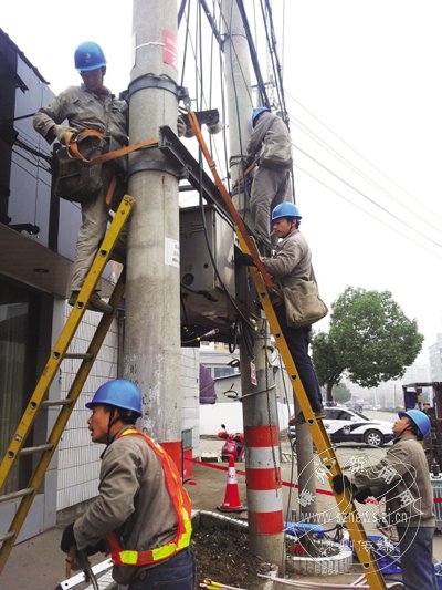 为确保春节供电畅通,连日来,市供电局对我市多个村庄、路段的供电变压器进行增容,拆旧换新。目前已对28个村、34台变压器进行增容,增容总量达4945千伏安,预计本周内可结束全部更换工作。图为工作人员正在市区长春路更换变压器。