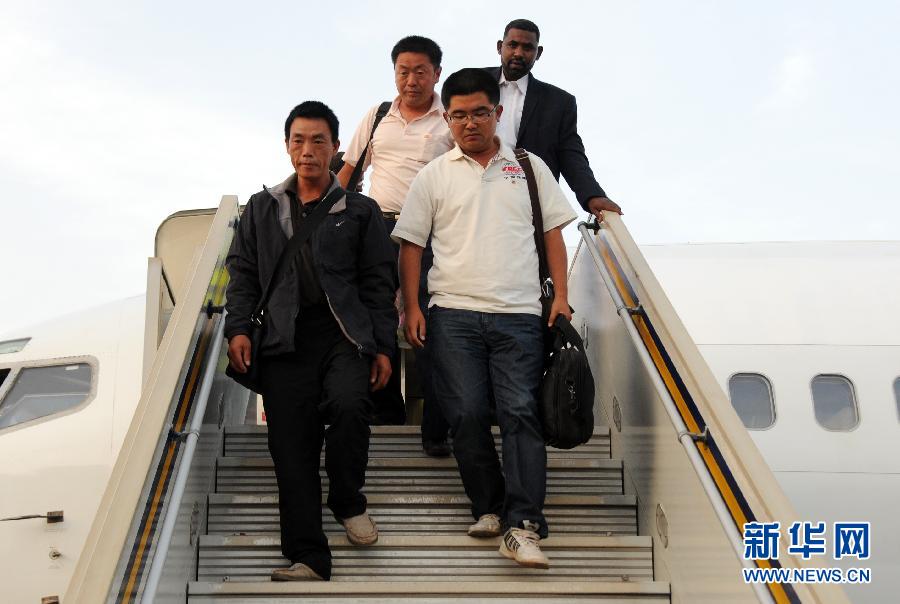 1月17日,在苏丹喀土穆机场,获释的3名中国员工走下飞机。当地时间1月16日,此前在苏丹西部达尔富尔地区被武装分子劫持的中铁十八局4名中国员工全部安全获释,并于17日抵达喀土穆。其中一名中国员工在劫持事件中被武装分子开枪击中腿部,其余人员均身体状况良好。新华社发(穆罕默德·巴比克尔摄)
