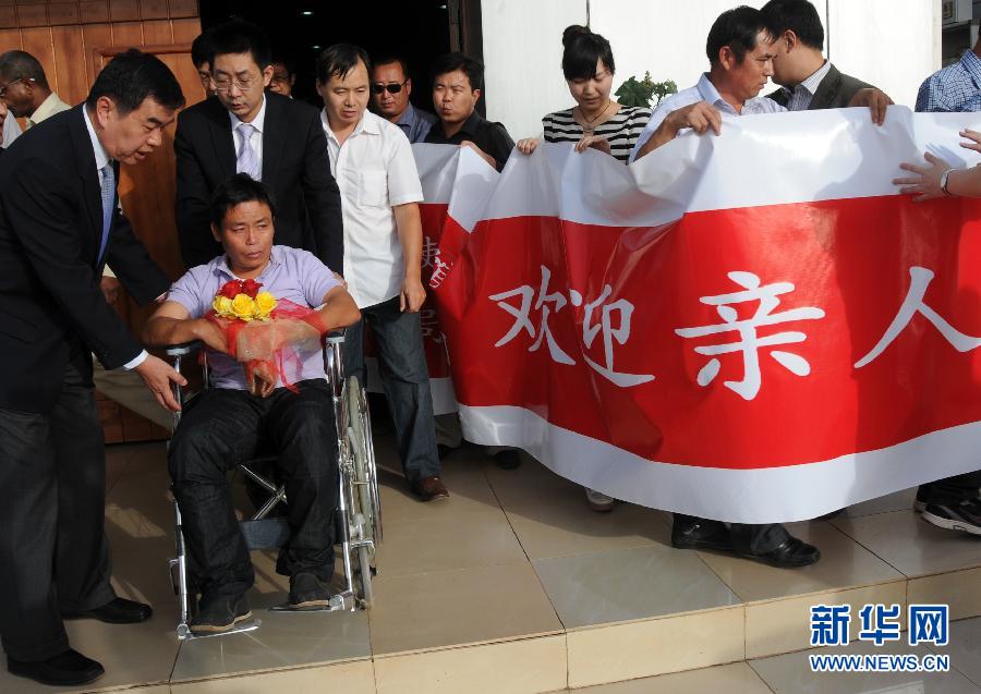 1月17日,在苏丹喀土穆机场,中国驻苏丹大使罗小光(左一)帮助坐在轮椅上的中国员工离开机场。当地时间1月16日,此前在苏丹西部达尔富尔地区被武装分子劫持的中铁十八局4名中国员工全部安全获释,并于17日抵达喀土穆。其中一名中国员工在劫持事件中被武装分子开枪击中腿部,其余人员均身体状况良好。新华社发(穆罕默德·巴比克尔摄)