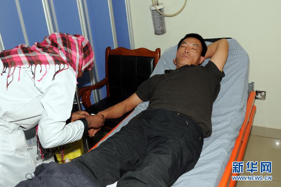 1月17日,一名获释的中国员工(右)在苏丹喀土穆一家医院接受健康检查。当地时间1月16日,此前在苏丹西部达尔富尔地区被武装分子劫持的中铁十八局4名中国员工全部安全获释,并于17日抵达喀土穆。其中一名中国员工在劫持事件中被武装分子开枪击中腿部,其余人员均身体状况良好。新华社发(穆罕默德·巴比克尔摄)